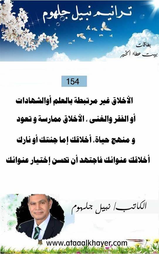 ترانيم نبيل جلهوم (154) من:الأخ الأستاذ / نبيل جلهوم عضو جمعية الكُتَّاب ببيت عطاء الخير عضو إتحاد الكتّاب و المثقفين العرب - مصر عضو رابطة أدباء الشام – لندن عضو الإتحاد العالمى للشعراء والمبدعين العرب عضو إتحاد المدربين العرب عضو رابطة الأدب الإسلامى العالمية http://www.ataaalkhayer.com/up/download.php?img=15678 |