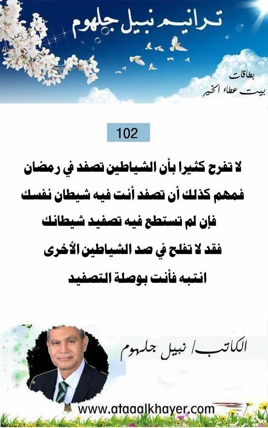 ترانيم نبيل جلهوم (102) من:الأخ الأستاذ / نبيل جلهوم عضو جمعية الكُتَّاب ببيت عطاء الخير عضو إتحاد الكتّاب و المثقفين العرب - مصر عضو رابطة أدباء الشام – لندن عضو الإتحاد العالمى للشعراء والمبدعين العرب عضو إتحاد المدربين العرب عضو رابطة الأدب الإسلامى العالمية http://www.ataaalkhayer.com/up/download.php?img=15310 |