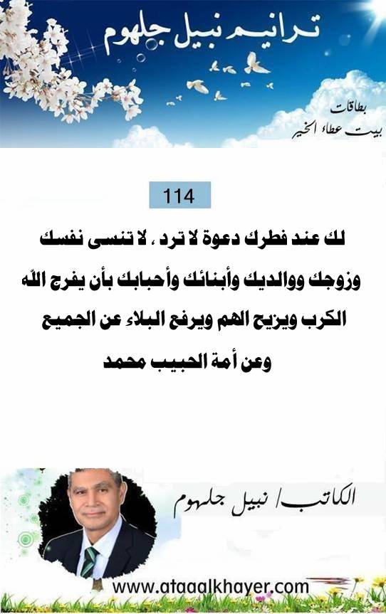 ترانيم نبيل جلهوم (114) من:الأخ الأستاذ / نبيل جلهوم عضو جمعية الكُتَّاب ببيت عطاء الخير عضو إتحاد الكتّاب و المثقفين العرب - مصر عضو رابطة أدباء الشام – لندن عضو الإتحاد العالمى للشعراء والمبدعين العرب عضو إتحاد المدربين العرب عضو رابطة الأدب الإسلامى العالمية http://www.ataaalkhayer.com/up/download.php?img=15422 |