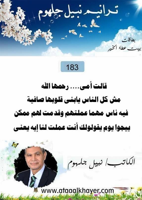 ترانيم نبيل جلهوم(183) من:الأخ الأستاذ / نبيل جلهوم عضو جمعية الكُتَّاب ببيت عطاء الخير عضو إتحاد الكتّاب و المثقفين العرب - مصر عضو رابطة أدباء الشام – لندن عضو الإتحاد العالمى للشعراء والمبدعين العرب عضو إتحاد المدربين العرب عضو رابطة الأدب الإسلامى العالمية http://www.ataaalkhayer.com/up/download.php?img=15818 |