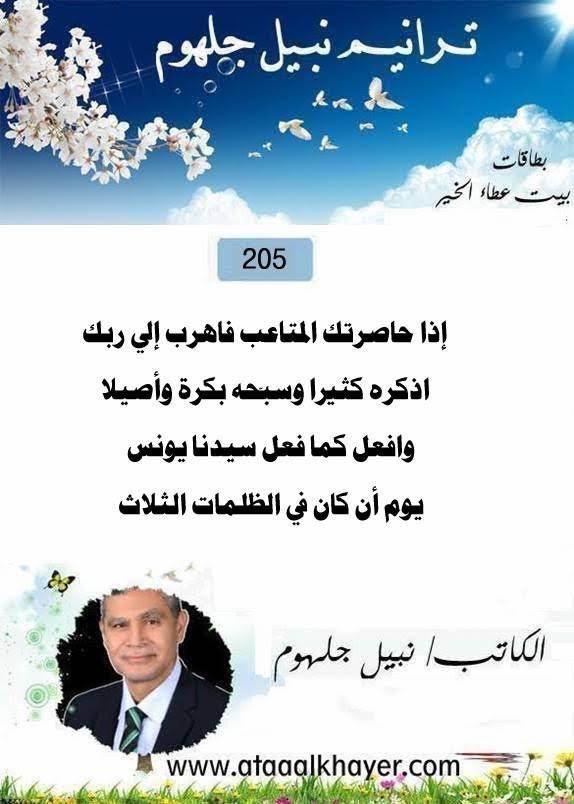 ترانيم نبيل جلهوم(205) من:الأخ الأستاذ / نبيل جلهوم عضو جمعية الكُتَّاب ببيت عطاء الخير عضو إتحاد الكتّاب و المثقفين العرب - مصر عضو رابطة أدباء الشام – لندن عضو الإتحاد العالمى للشعراء والمبدعين العرب عضو إتحاد المدربين العرب عضو رابطة الأدب الإسلامى العالمية http://www.ataaalkhayer.com/up/download.php?img=15898 |