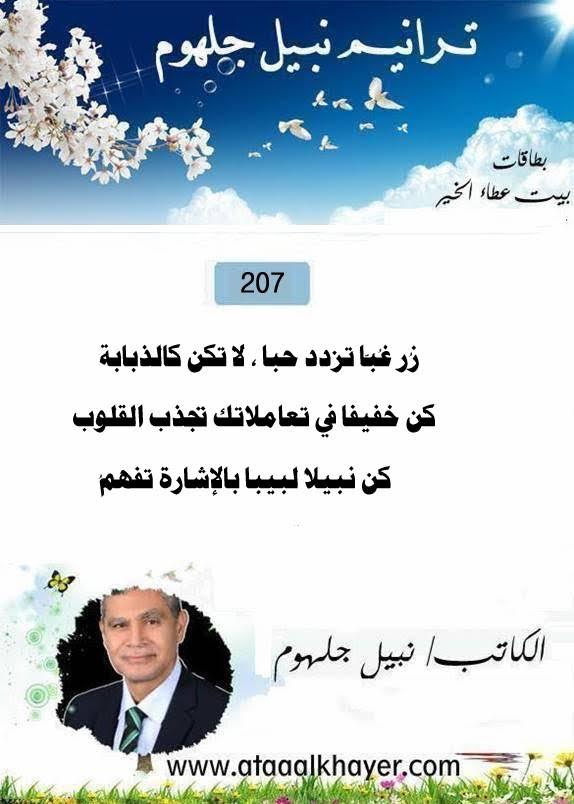 ترانيم نبيل جلهوم(207) من:الأخ الأستاذ / نبيل جلهوم عضو جمعية الكُتَّاب ببيت عطاء الخير عضو إتحاد الكتّاب و المثقفين العرب - مصر عضو رابطة أدباء الشام – لندن عضو الإتحاد العالمى للشعراء والمبدعين العرب عضو إتحاد المدربين العرب عضو رابطة الأدب الإسلامى العالمية http://www.ataaalkhayer.com/up/download.php?img=15904 |