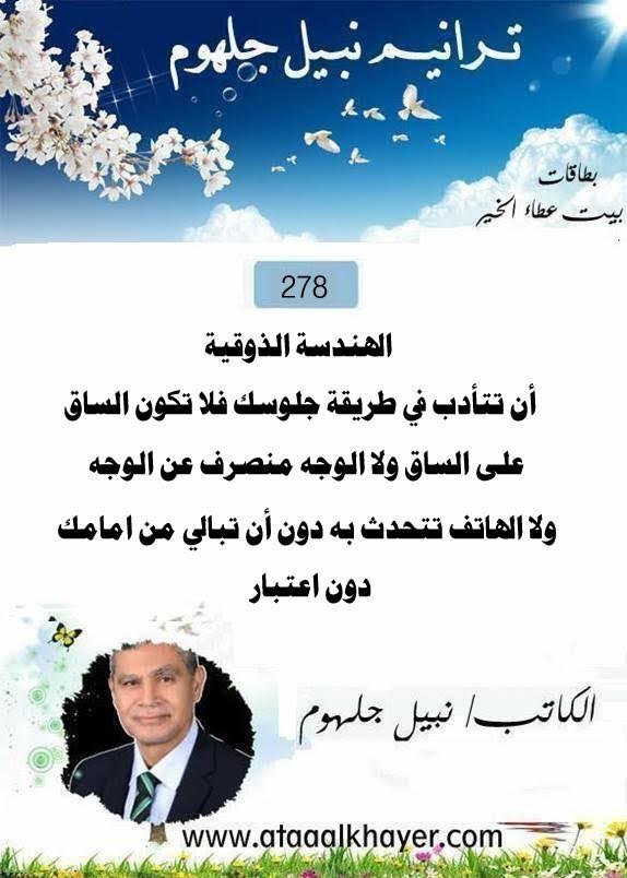 ترانيم نبيل جلهوم(278) من:الأخ الأستاذ / نبيل جلهوم عضو جمعية الكُتَّاب ببيت عطاء الخير عضو إتحاد الكتّاب و المثقفين العرب - مصر عضو رابطة أدباء الشام – لندن عضو الإتحاد العالمى للشعراء والمبدعين العرب عضو إتحاد المدربين العرب عضو رابطة الأدب الإسلامى العالمية http://www.ataaalkhayer.com/up/download.php?img=16166 |