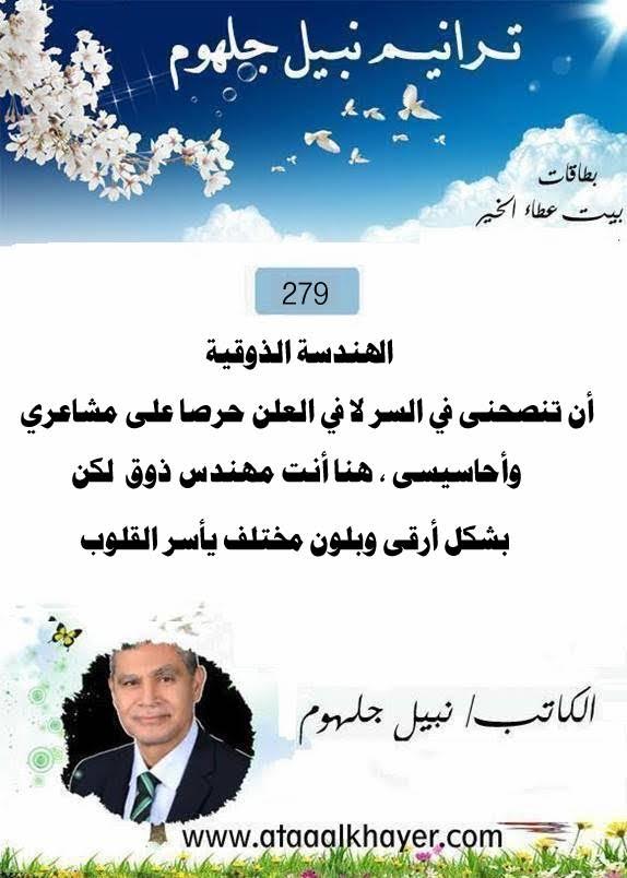ترانيم نبيل جلهوم(279) من:الأخ الأستاذ / نبيل جلهوم عضو جمعية الكُتَّاب ببيت عطاء الخير عضو إتحاد الكتّاب و المثقفين العرب - مصر عضو رابطة أدباء الشام – لندن عضو الإتحاد العالمى للشعراء والمبدعين العرب عضو إتحاد المدربين العرب عضو رابطة الأدب الإسلامى العالمية http://www.ataaalkhayer.com/up/download.php?img=16169 |