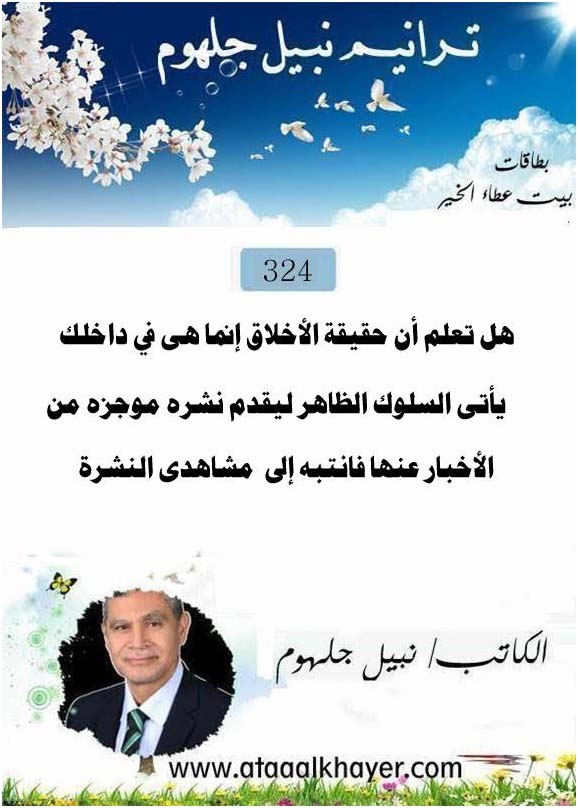 ترانيم نبيل جلهوم(324) من:الأخ الأستاذ / نبيل جلهوم عضو جمعية الكُتَّاب ببيت عطاء الخير عضو إتحاد الكتّاب و المثقفين العرب - مصر عضو رابطة أدباء الشام – لندن عضو الإتحاد العالمى للشعراء والمبدعين العرب عضو إتحاد المدربين العرب عضو رابطة الأدب الإسلامى العالمية http://www.ataaalkhayer.com/up/download.php?img=16300 |