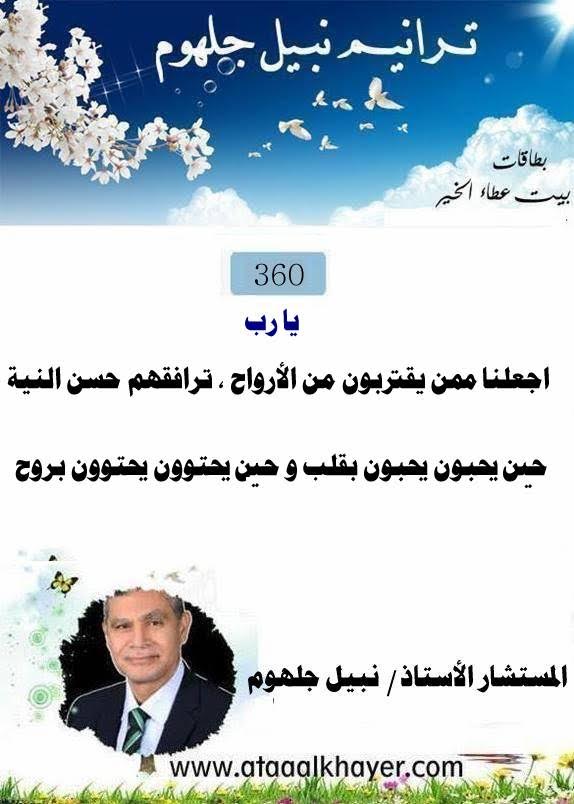 ترانيم نبيل جلهوم(360) من:الأخ الأستاذ / نبيل جلهوم عضو جمعية الكُتَّاب ببيت عطاء الخير عضو إتحاد الكتّاب و المثقفين العرب - مصر عضو رابطة أدباء الشام – لندن عضو الإتحاد العالمى للشعراء والمبدعين العرب عضو إتحاد المدربين العرب عضو رابطة الأدب الإسلامى العالمية http://www.ataaalkhayer.com/up/download.php?img=16423 |