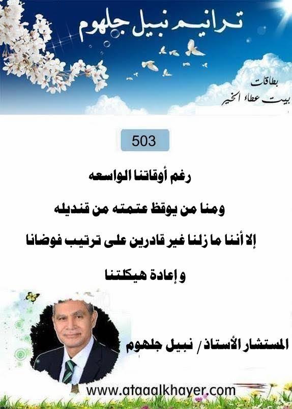 ترانيم نبيل جلهوم(503) من:الأخ الأستاذ / نبيل جلهوم عضو جمعية الكُتَّاب ببيت عطاء الخير عضو إتحاد الكتّاب و المثقفين العرب - مصر عضو رابطة أدباء الشام – لندن عضو الإتحاد العالمى للشعراء والمبدعين العرب عضو إتحاد المدربين العرب عضو رابطة الأدب الإسلامى العالمية http://www.ataaalkhayer.com/up/download.php?img=17011 http://www.ataaalkhayer.com/up/download.php?img=17012 |