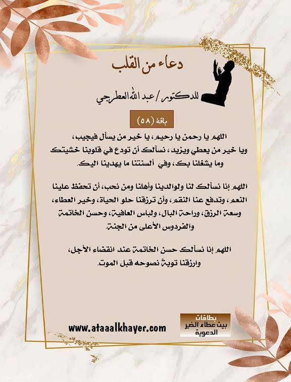 من الأخ الدكتور / عبدالله بن مراد العطرجي عضو جمعية الكُتَّاب ببيت عطاء الخير دعاء من القلب (58) http://www.ataaalkhayer.com/up/download.php?img=18080 |