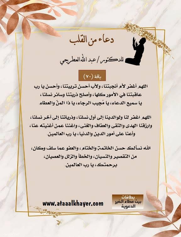 من الأخ الدكتور / عبدالله بن مراد العطرجي عضو جمعية الكُتَّاب ببيت عطاء الخير دعاء من القلب (70) http://www.ataaalkhayer.com/up/download.php?img=18104 |