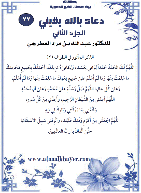 من الأخ الدكتور / عبدالله بن مراد العطرجي عضو جمعية الكُتَّاب ببيت عطاء الخير دعاء بالله يقيني - الجزء الثاني (77) http://www.ataaalkhayer.com/up/download.php?img=19112 |