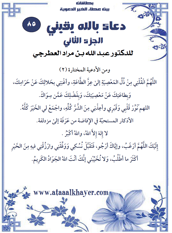 من الأخ الدكتور / عبدالله بن مراد العطرجي عضو جمعية الكُتَّاب ببيت عطاء الخير دعاء بالله يقيني - الجزء الثاني (85) http://www.ataaalkhayer.com/up/download.php?img=19134 |