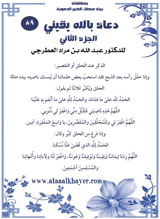 من الأخ الدكتور / عبدالله بن مراد العطرجي عضو جمعية الكُتَّاب ببيت عطاء الخير دعاء بالله يقيني - الجزء الثاني (89) http://www.ataaalkhayer.com/up/download.php?img=19150 |