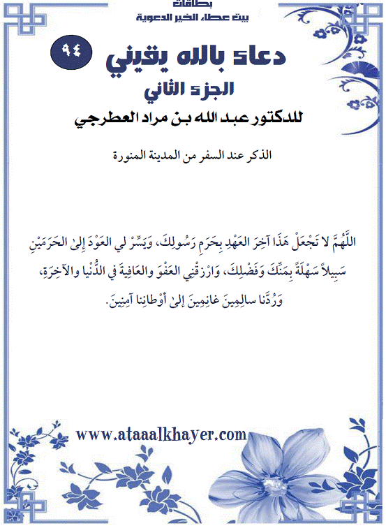من الأخ الدكتور / عبدالله بن مراد العطرجي عضو جمعية الكُتَّاب ببيت عطاء الخير دعاء بالله يقيني - الجزء الثاني (94) http://www.ataaalkhayer.com/up/download.php?img=19169 |