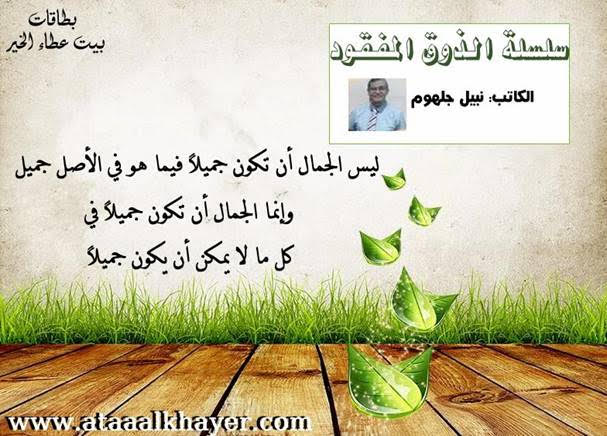 سلسلة الذوق المفقود (13) من:الأخ الأستاذ / نبيل جلهوم عضو جمعية الكُتَّاب ببيت عطاء الخير عضو إتحاد الكتّاب و المثقفين العرب - مصر عضو رابطة أدباء الشام – لندن عضو الإتحاد العالمى للشعراء والمبدعين العرب عضو إتحاد المدربين العرب عضو رابطة الأدب الإسلامى العالمية |